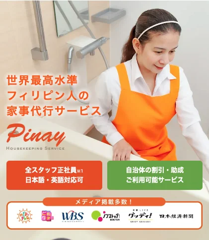 | 3位 ピナイ家事代行サービス | 家政婦の本場フィリピンでノウハウを学んだスタッフがサービスを提供 スタッフが若く、体力がある。 | 掃除、洗濯、料理、整理整頓、送迎、キッズケア | ・プライムアウトレット:1,650円~ ・初回お試しプラン:5,000円(2時間・交通費込み) ・定期プラン:4,180円~ ・スポットプラン:5,060円 | 東京都、神奈川県、大阪府、兵庫県 ※一部の地域を除く | 8:30~19:30 ※日曜は除く | ※サービス予定日2日前の17:00までに連絡で別日に振替対応。 |